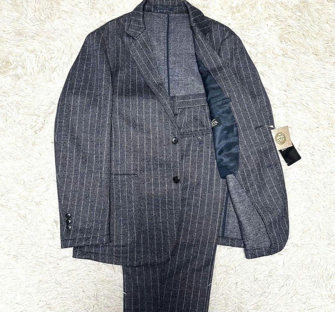 美品 現行タグ LES MUES 洗える スリーピース ブラック ストライプ L 洗える ストレッチ スリーピーススーツ 紺無地 LES MUES
